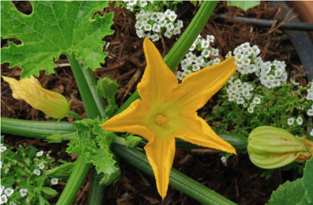 The classic design method for ornamentals in containers is “Thriller, filler, and spiller”. Thriller is the attention-getter, filler takes up the spaces, spiller gets planted on the edges so it can dangle over the sides. Edibles can be set up the same way. ‘Pesto Perpetuo’ (thriller) is a variegated basil that looks like an ornamental but is perfectly edible and does not flower. It grows 2’-3’ high. ‘Bambino’ is a compact marigold (filler) that grows about 8” tall. ‘Tumbling Tom’ tomato works as the spiller on the edge. Solo plants and dynamic duos are also good. Plants in the mint family will take over in a grouping and need their own space. Potatoes are best left as solo performers, too.