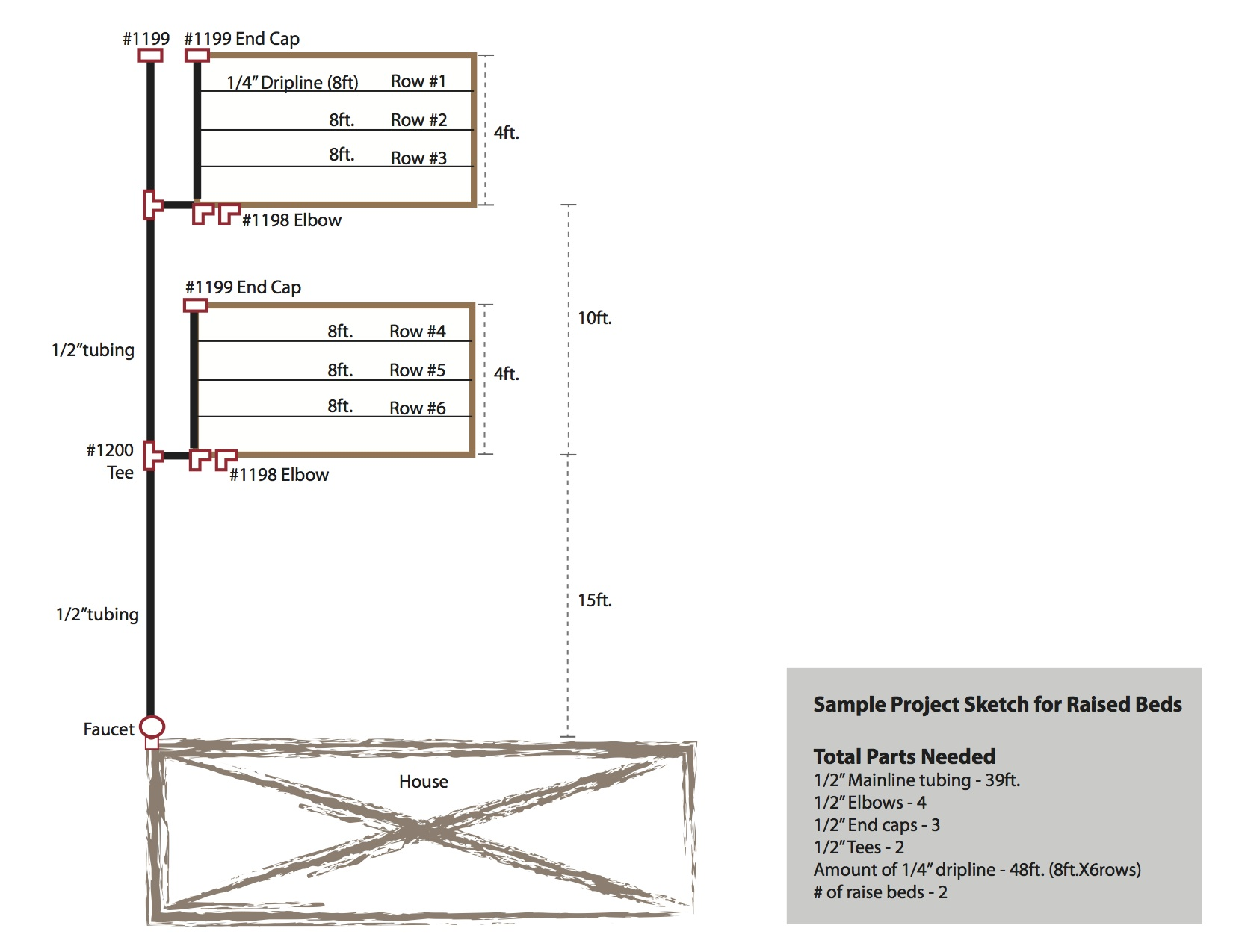 Our kits are designed to use a header row of 1⁄2” tubing along one side of your raised bed. The next step is to tap into the header row and run 1⁄4” dripline perpendicular to the header row, the length of the bed. We recommend spacing the 1⁄4” dripline rows 12” apart. For example: if you have a raised bed with dimensions of 8 ft x 4 ft and the header row is placed on the 4 ft side of the bed, you would then have 3 - 8ft rows of 1⁄4” dripline. Meaning that you need a total of 24ft of 1⁄4” dripline per bed. Calculate the amount of 1⁄4” dripline needed per bed and then add the amount per bed to find the total amount of 1⁄4” dripline needed for your raised bed project. (Note: for 1⁄4” tubing the run length must be under 30 ft.)