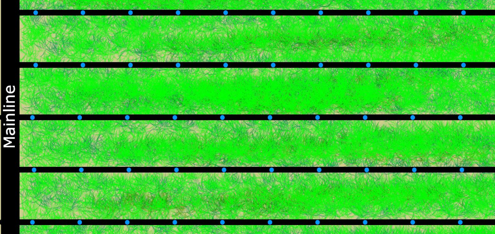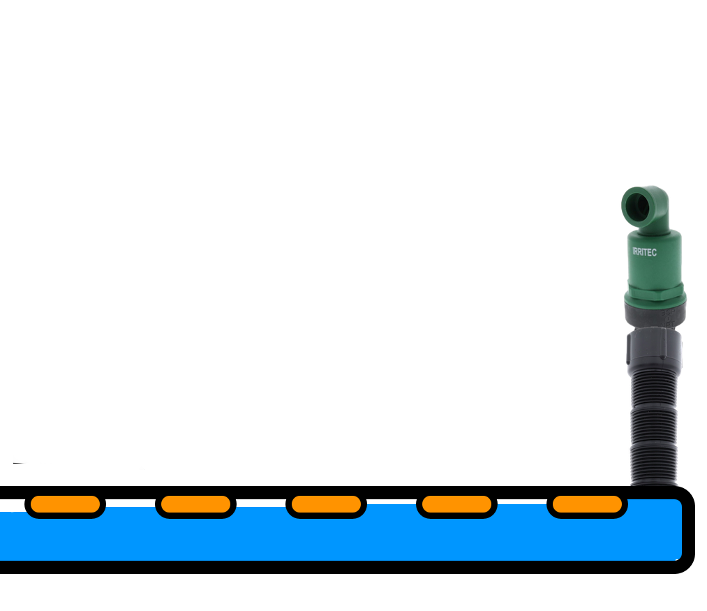The emitter line is typically buried between 4” - 6” for lawn and turf, and 4” to 14” for other applications such as smaller plantings and shrubs. The capillary action of the soil will see the water spread evenly throughout the root system. The roots will, in turn, be drawn to the water. This type of direct watering contributes to a strong established root system and healthy turf.