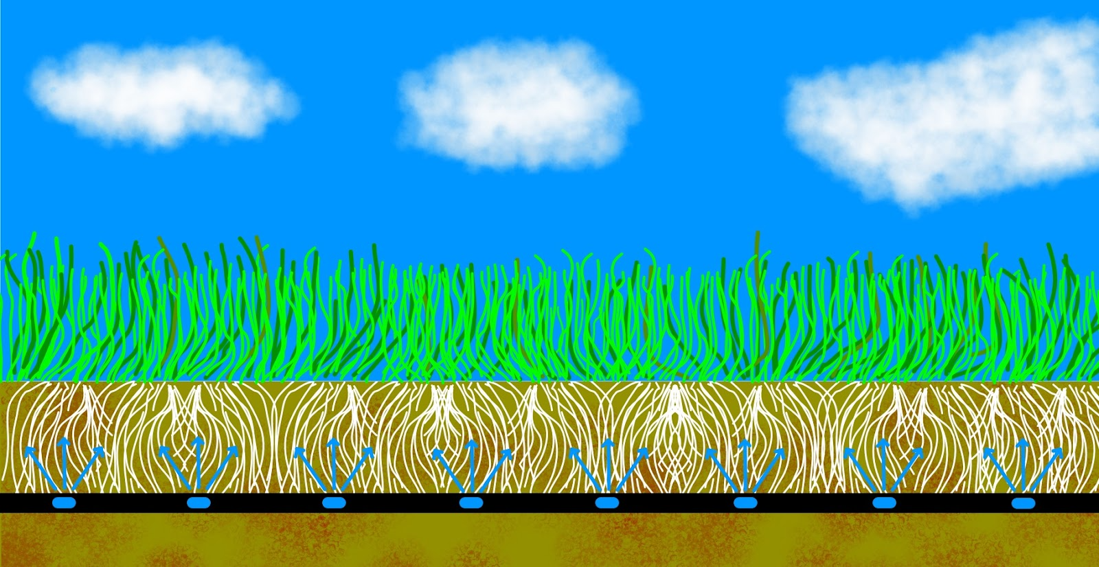 This evolution has culminated with the use of sub-surface lawn irrigation. Sub-surface lawn irrigation is essentially drip irrigation applied to turf and lawn. The same hyper-efficient drip technology that has been widely adopted by farmers and growers the world wide for the crops that are the lifeblood of their labor has been discovered to be just as effective and efficient when used in lawn applications.