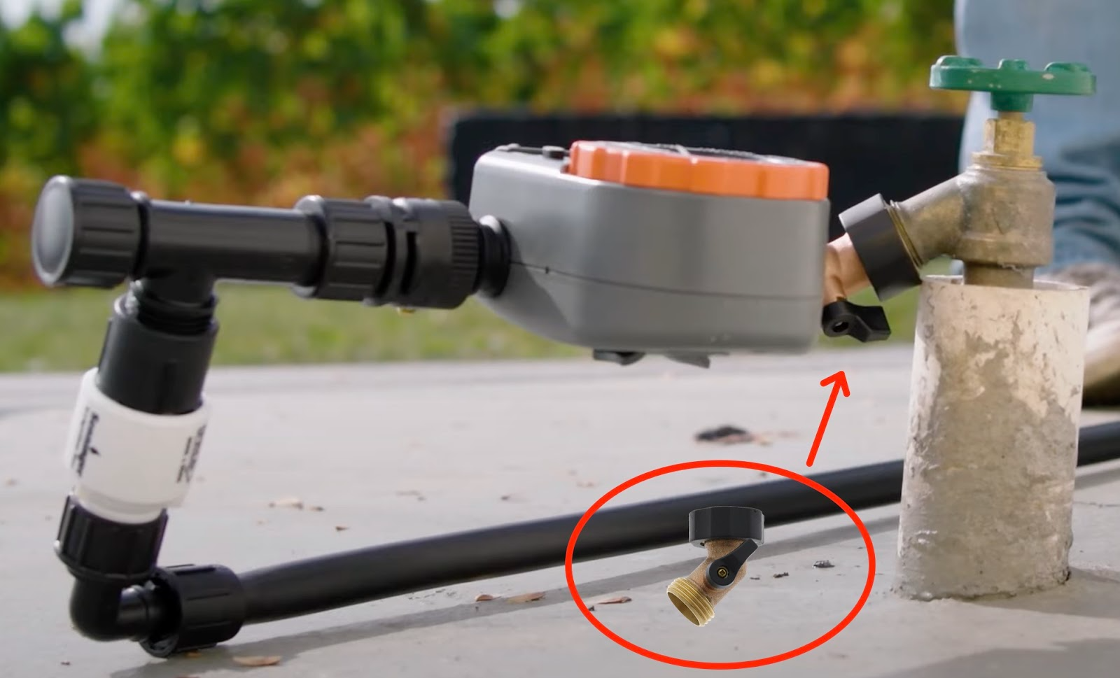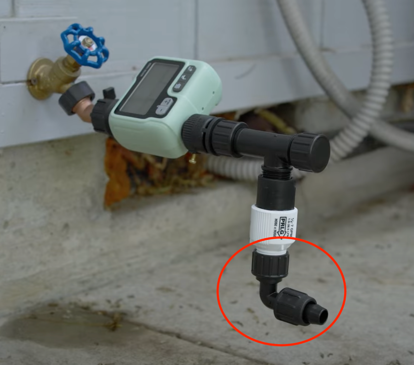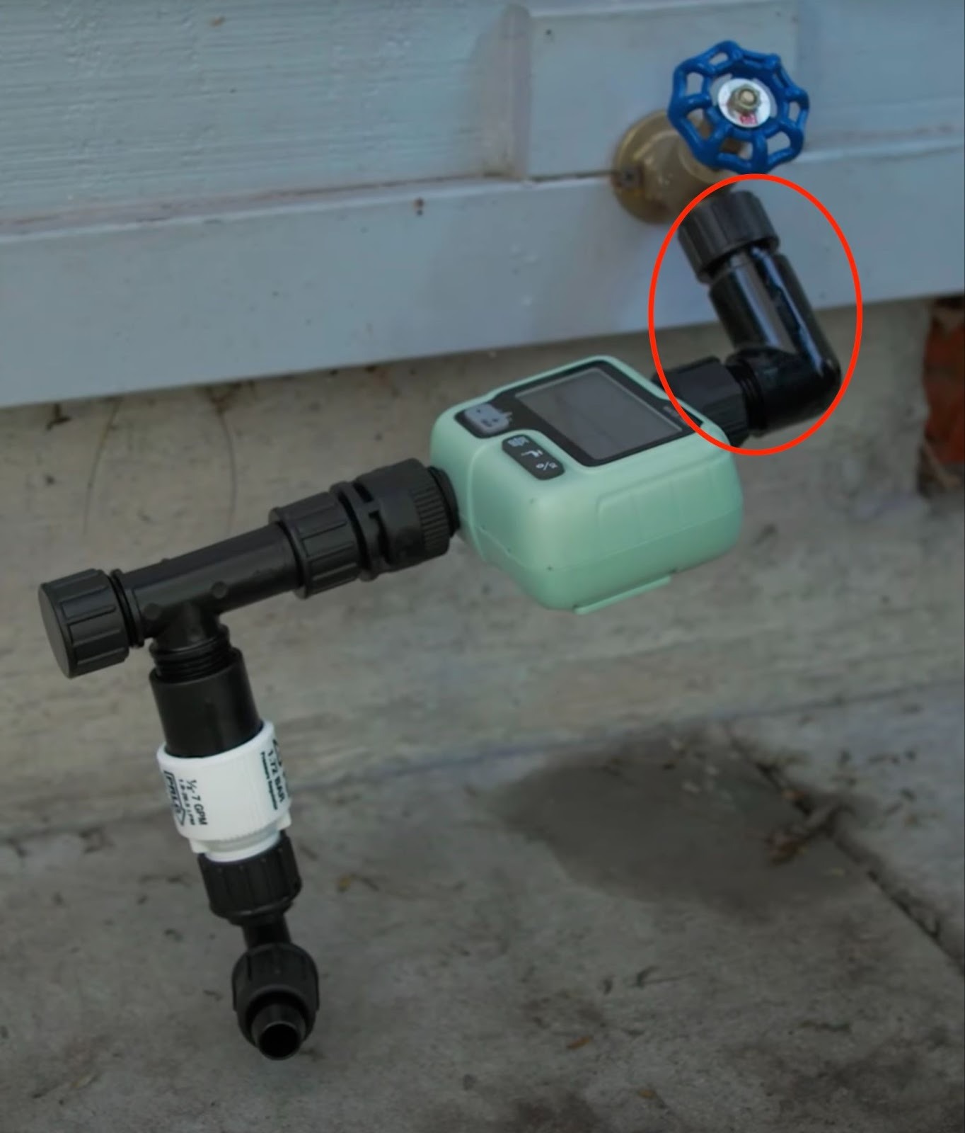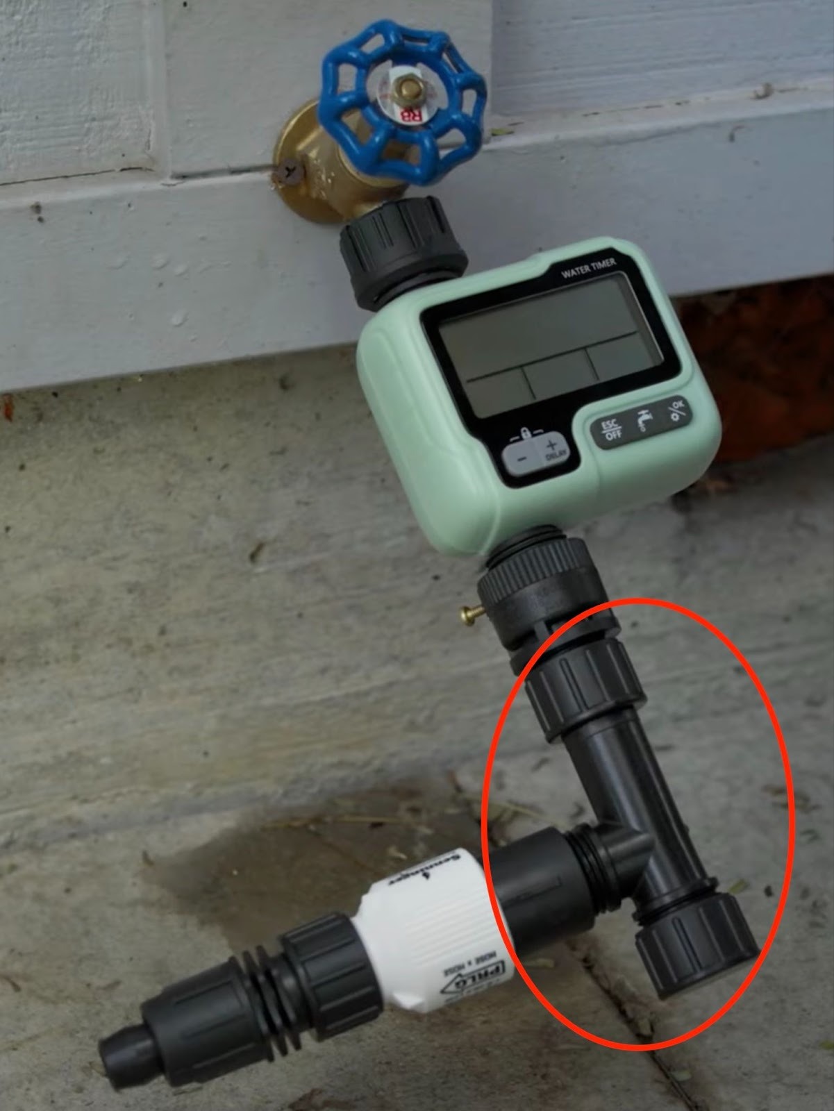 On a hose bib that low to the ground, a head assembly, let alone one with a timer, would appear to be almost impossible. Fortunately, all it takes is a gooseneck adapter to allow the assembly to be built horizontally as seen below.