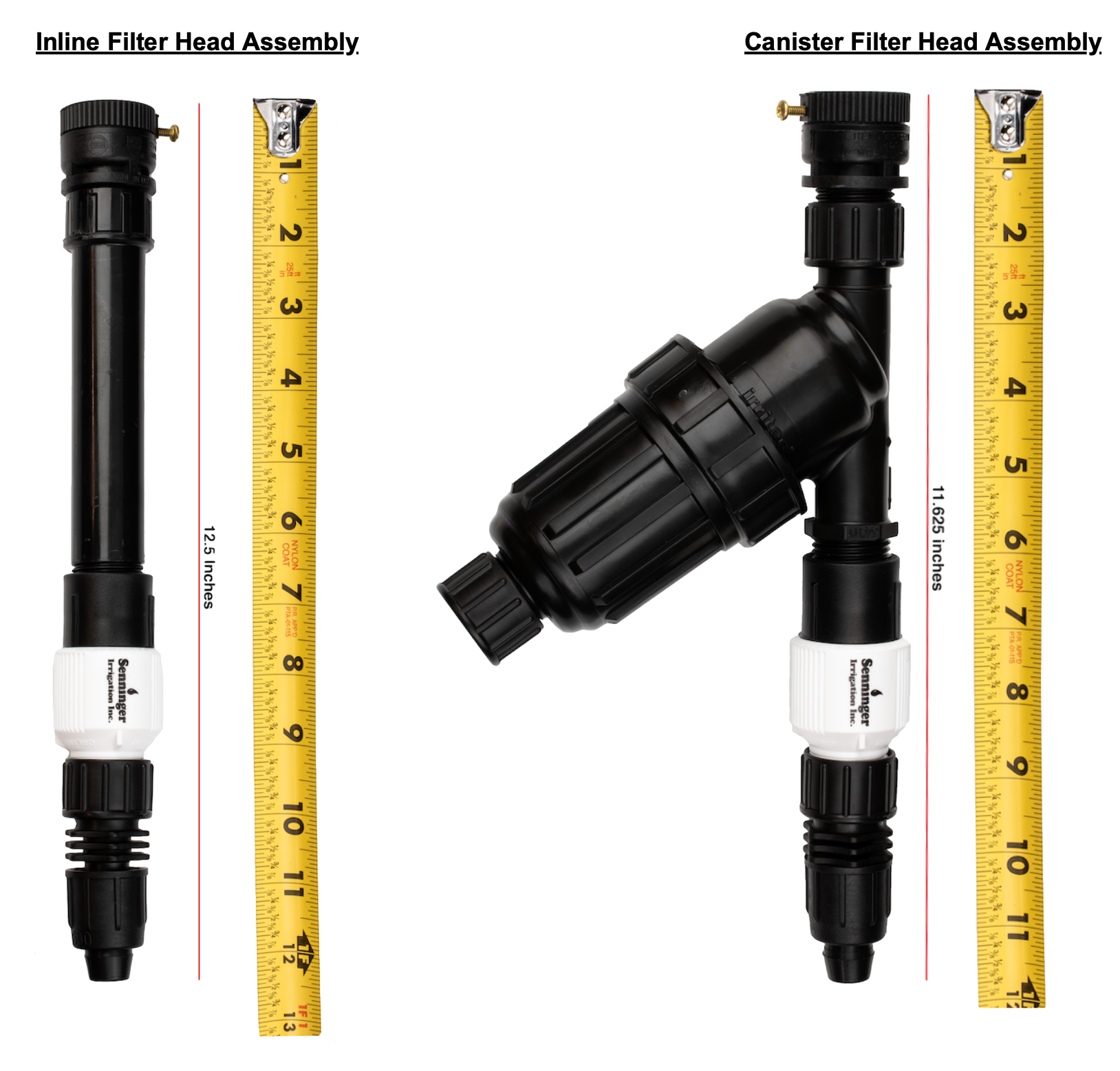 We took some measuring tape to the two head assemblies we see most frequently, the inline filter head assembly and the canister filter head assembly. As you can see below, these would be much too long to fit on a hose bib that’s close to the ground, even if the hose bib was at a 30° to 45° angle.